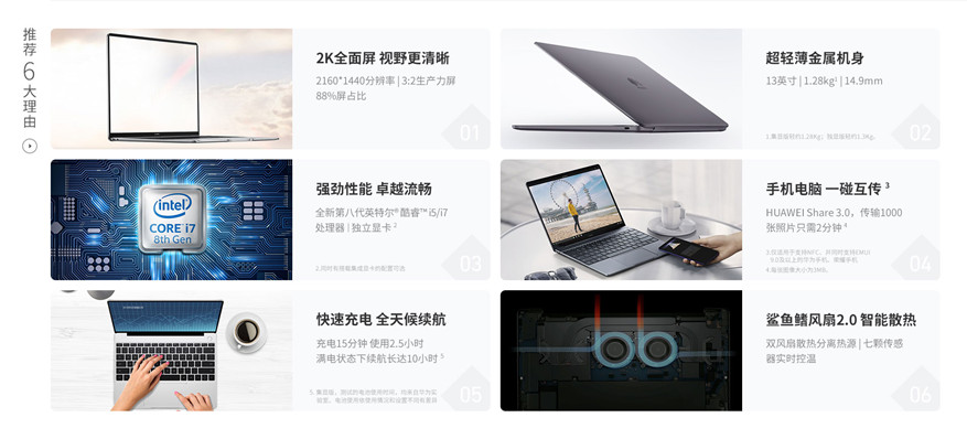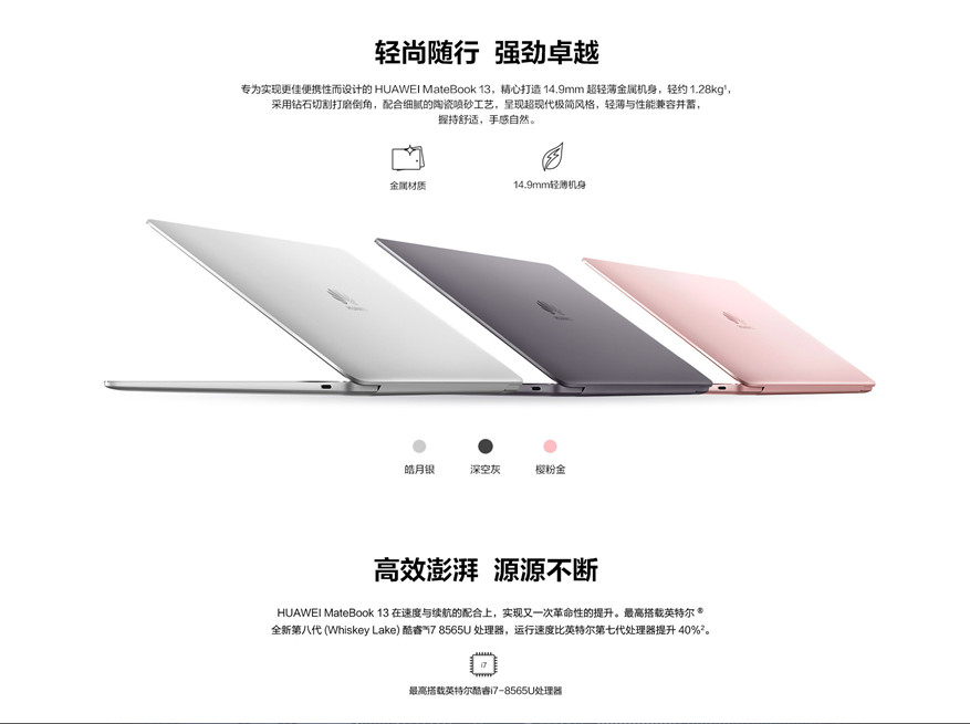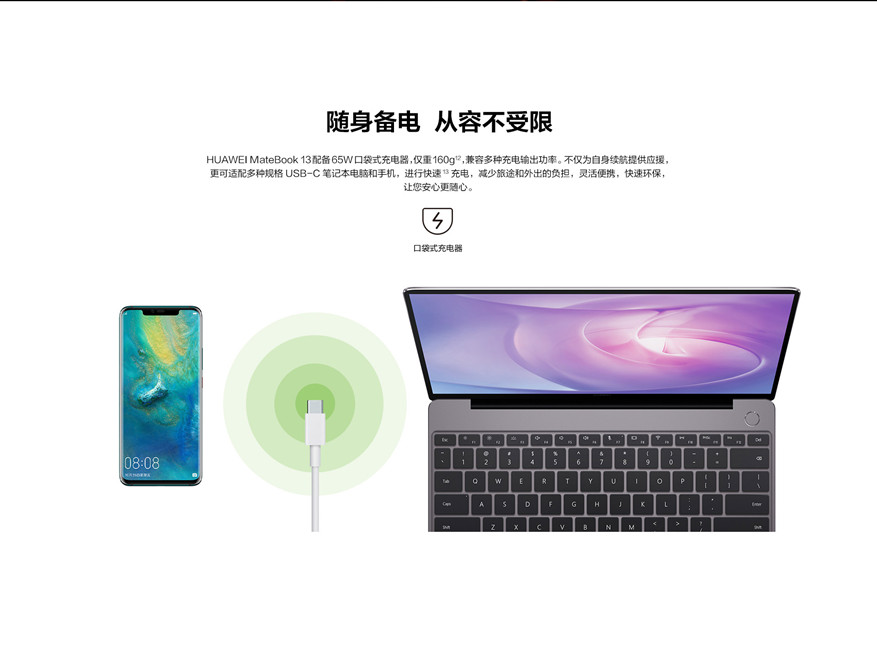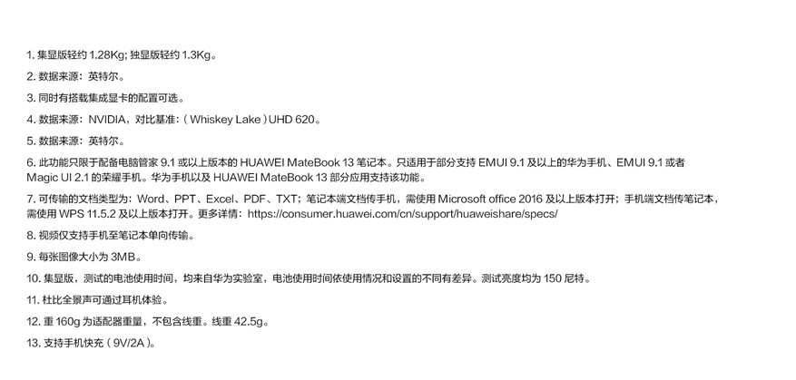 HUAWEI MateBook 13 主機 X 1HUAWEI USB-C 電源適配器65W X 1電源適配器線(USB-C) X 1USB-C 轉(zhuǎn) USB-A 轉(zhuǎn)接線 X 1快速入門 X 1保修卡 X 1Huawei Share 3.0 一碰傳快速入門 X 1S/N三聯(lián)貼標簽 X 1