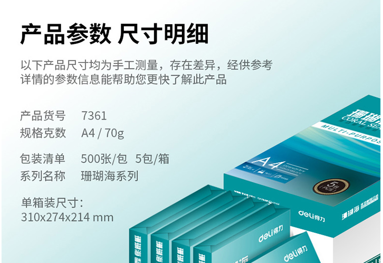 得力(deli)珊瑚海 70g A4 復印紙 500張/包 5包/箱(2500張)